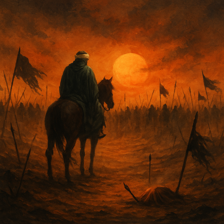 Imam Hussain (a.s.) weigerte sich, die Herrschaft eines tyrannischen Kalifen anzuerkennen. In Karbala, am 10. Muharram (Ashura), wurde er zusammen mit seinen Gefährten grausam ermordet. Sein Märtyrertod ist ein ewiges Symbol für den Kampf gegen Unterdrückung und die Verteidigung der Wahrheit.